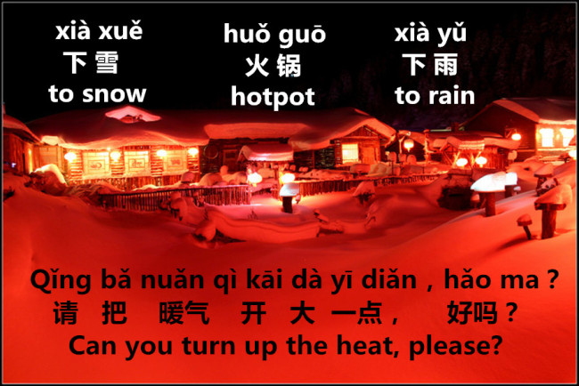 to rain下雨,to snow下雪,hotpot火锅,Can you turn up the heat, please? 请把暖气开大一点,好吗?All in today’s Chinese Studio.
